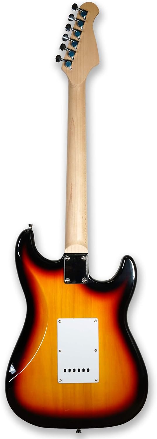 * left-handed electric guitar, bolt_ on maple neck,composite ebony fingerboard, tobacco sunburst finish * 22 frets, die-cast machinehead, chrome hardware, truss rod on headstock * 3 single coil pickups, 5 way selector switch,1 volume & 2 tone controls, sealed precision tuners, 3-ply white pickguard, with a tremolo bar