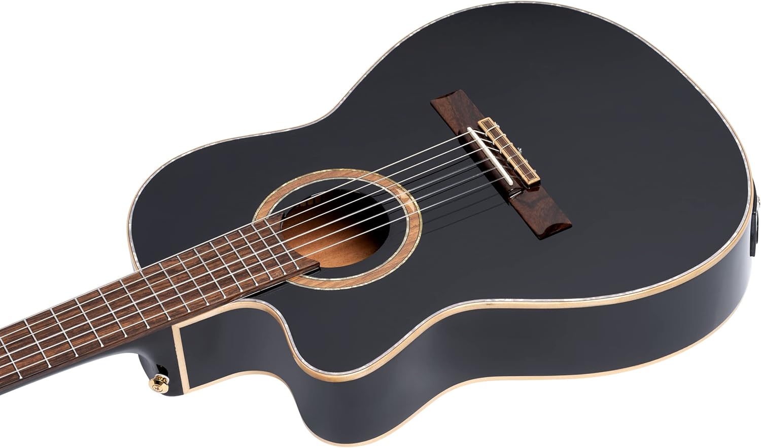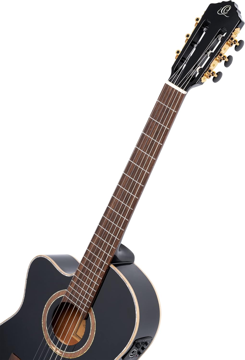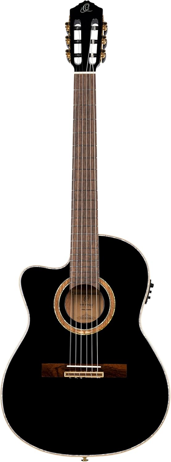 Mahogany Neck, Black Gloss Finish – Indian Laurel Fretboard & Bridge – Maple Binding & Pearl Purfling – Ortega Signature Walnut/Maple/White Pearl Rosette