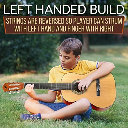 Features: – 36” Size Guitar – Left-hand guitar – Traditional / Classic Body Style – Hand-Crafted Wooden Construction – Protective Binding – High-Gloss Polished Body & Back – Machine Head: Chrome 3-in-Line – Dyed Wood Design, Rosette Linden Laminate Finish – Starter Guitar Design Perfect for Beginners & Children What’s in the Box: – Guitar – Guitar Picks – Digital Guitar Tuner – Spare Guitar Strings – Travel / Storage Guitar Gig Bag – Detachable Guitar Shoulder Strap – Cleaning Cloth Digital Guitar Tuner: – Convenient Clip-on Design – Tuning Range: A0 – C8 (27.5 – 4186 Hz) – Response Time: Technical Specs: – Total Guitar Length: 36” -inches – Scale Length: 22.83” -inches (580mm) – Total Body Length: 17.32” -inches (440mm) – Total Neck Length (Nut to Body): 18.5’’ -inches (470mm) – Headstock Material: Birch – Fretboard/Fingerboard Material: Dyed wood – Number of Frets: 18 Frets – Guitar Body Material: Linden Wood – Guitar String Material: Nylon string – Total Guitar Dimensions (L x W x H): 35.83″ x 13.39″ x 3.35″ –inches