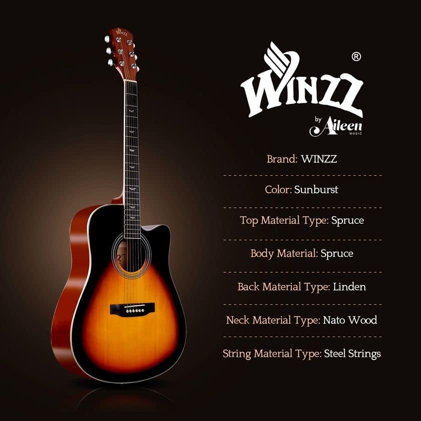 WINZZ AF168C Full Size Spruce Acoustic Acustica Guitar Cutaway for Adult Beginners Students with Advanced Kit Right Handed, 41 Inches, Sunburst