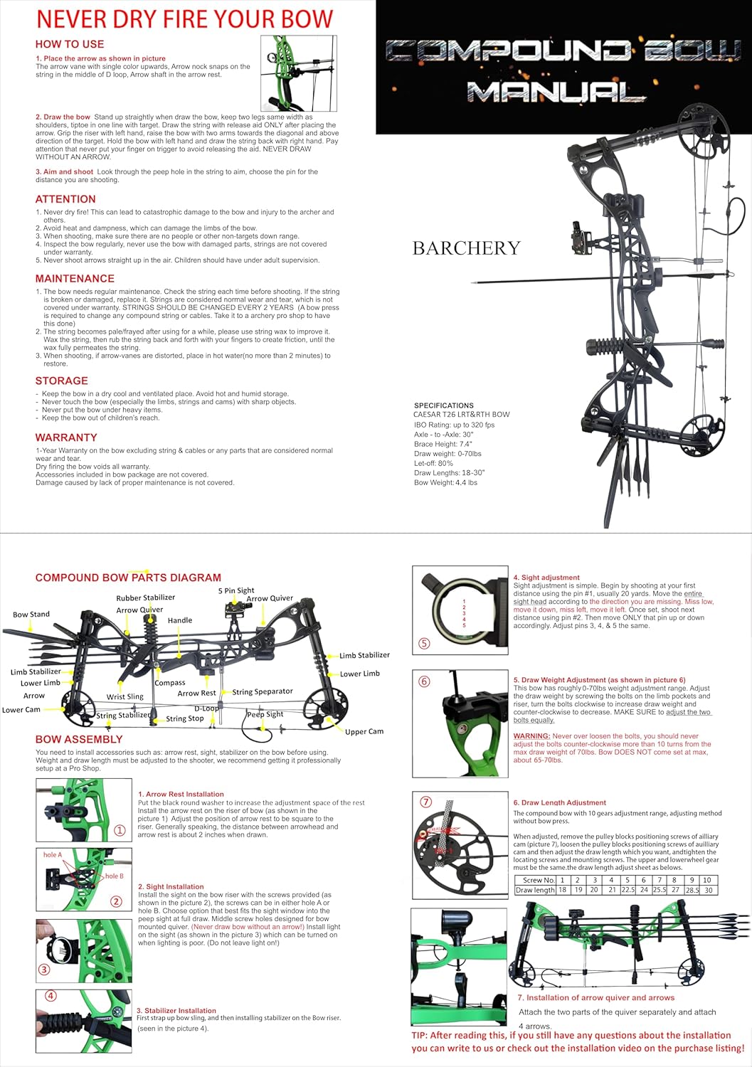 【WARM TIP】You need to install all the accessories before use, if you are a new shooter, you can watch our installation video.Never DRY FIRE (shoot the bow without arrow)! For the extra replacement string and cables, B0D3HNTTRQ is for the CENWTY T26.