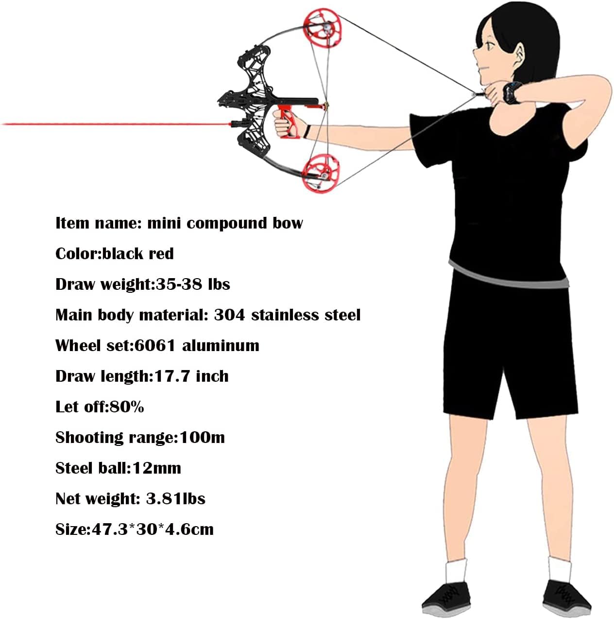 【Parameter】Draw weight: 35 Lbs; Draw length: 17.7″;Main body material: 304 stainless steel ;Wheel set:6061 aluminum;Let off:80%;Shooting range:100m;Steel ball:12mm;Net weight: 3.81lbs