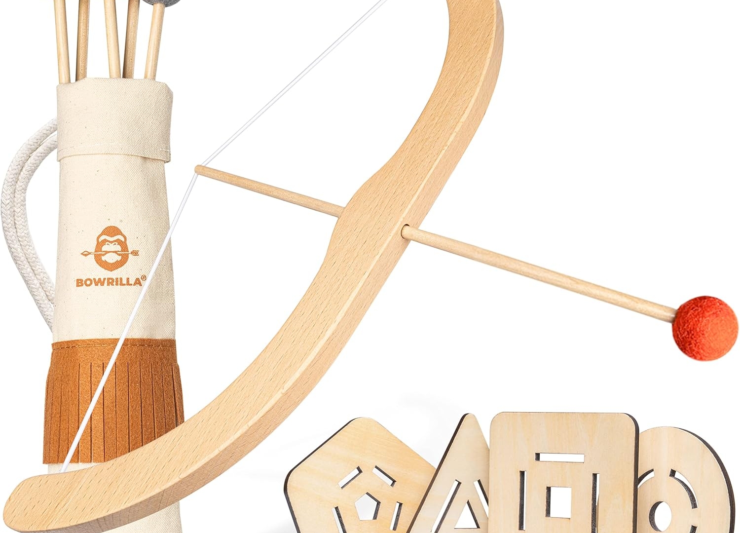 BOWRILLA® Kids Bow and Arrow Set | Wooden Archery Toy for Boys & Girls Aged 3-7, Bow and Arrow for Kids | Includes 5 Arrows, 4 Targets, Cotton Quiver | Indoor & Outdoor Play