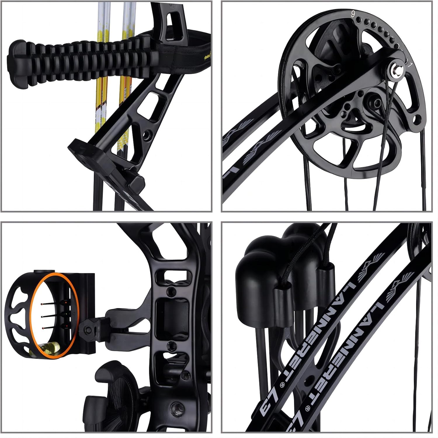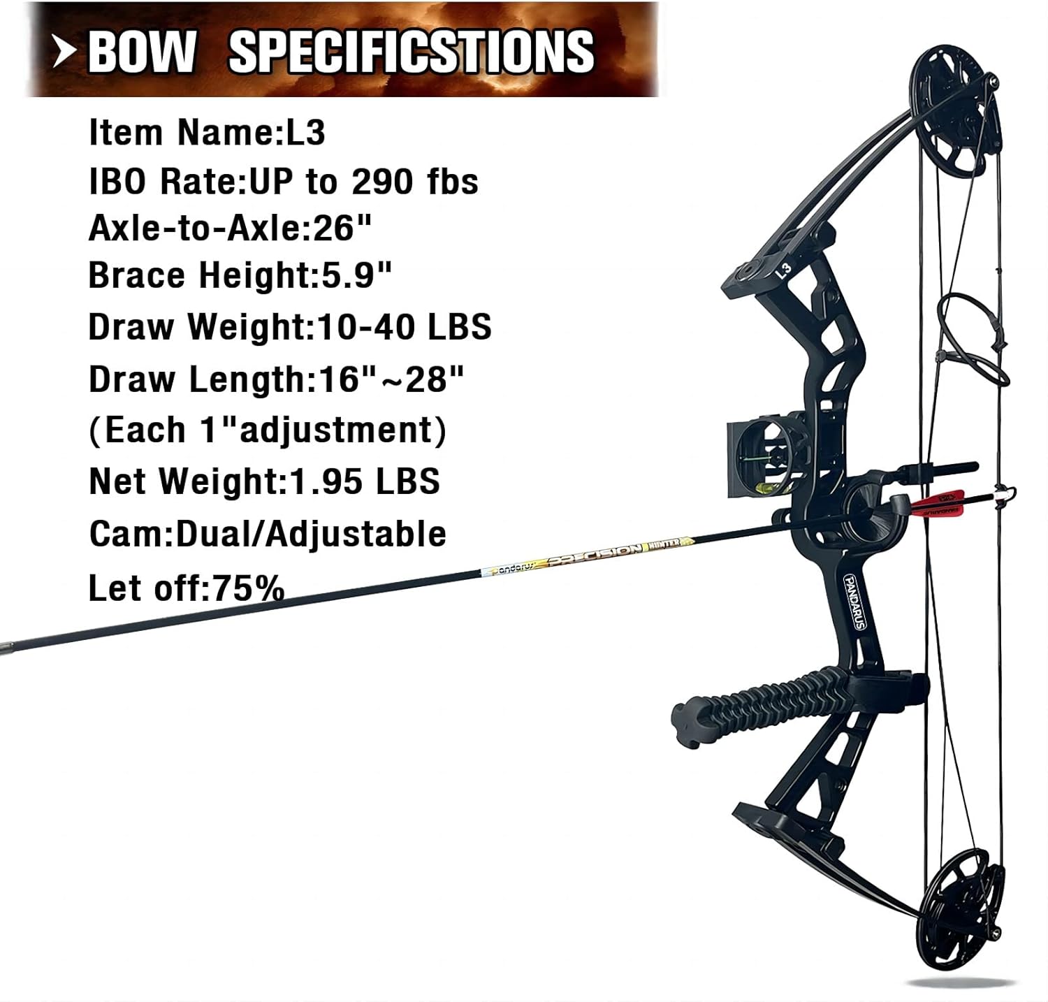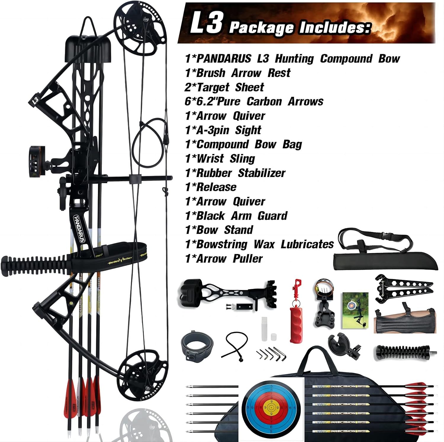 ProPackage: 1*PANDARUS L3 Hunting Compound Bow,1*Brush Arrow Rest 2*Target Sheet,6* 6.2″Pure Carbon Arrows1*Arrow Quiver,1*A -3pin Sight,1*Compound Bow Bag,1*Wrist Sling,1*Rubber Stabilizer ,1*Release ,1*Arrow Quiver,1*Black Arm Guard,1*Bow Stand,1*Bowstring Wax Lubricates,1*Arrow Puller