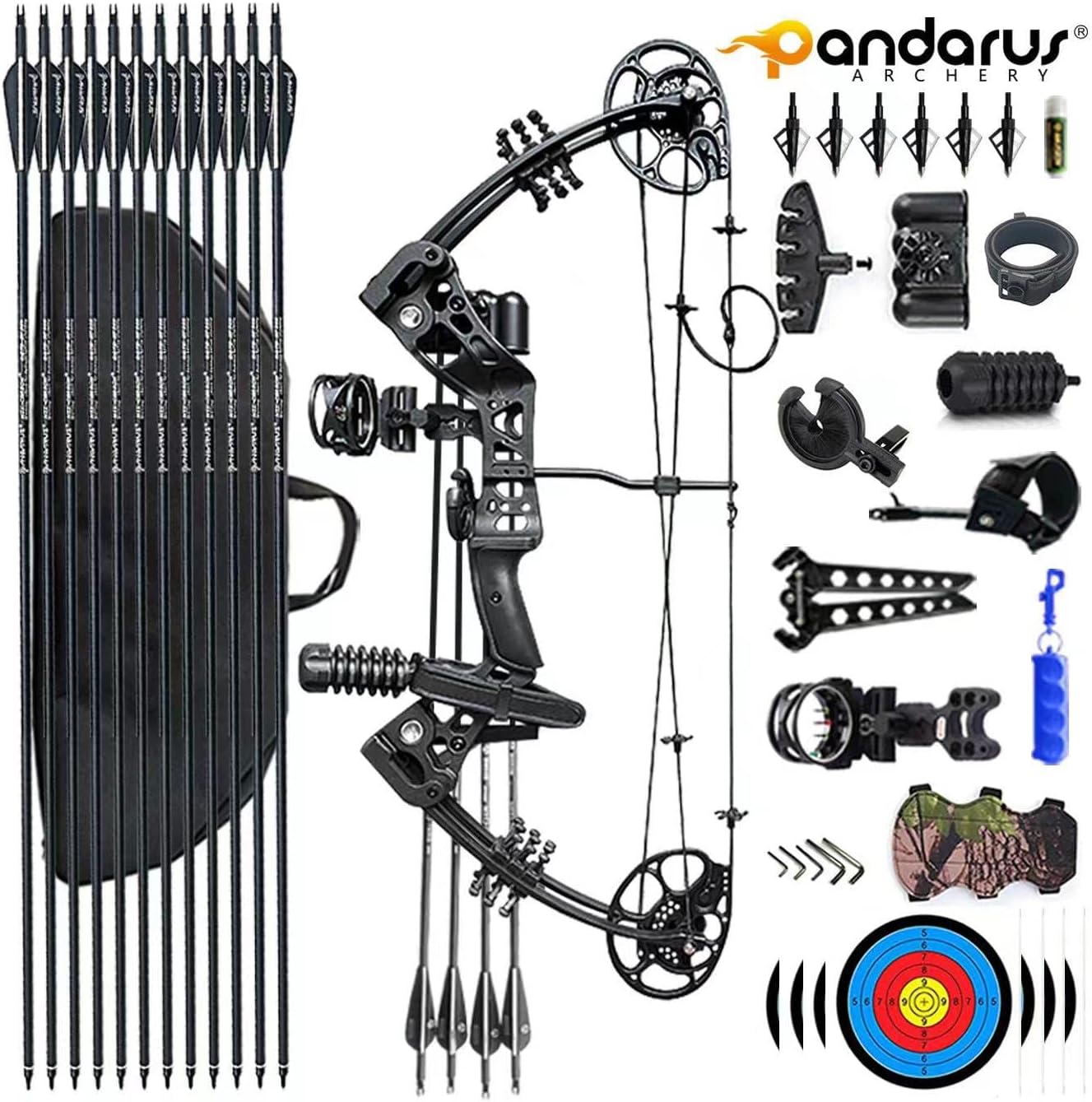 PACKING LIST: Hunting Compound Bow、3-Pin Compound Bow Sight、Whisker arrow test 、Rubber Stabilizer 、Peep Sight 、Wrist Sling 、Arrow Quiver 、Allen Key、 Wax 、 4xTarget sheet、6xCarbon Arrows