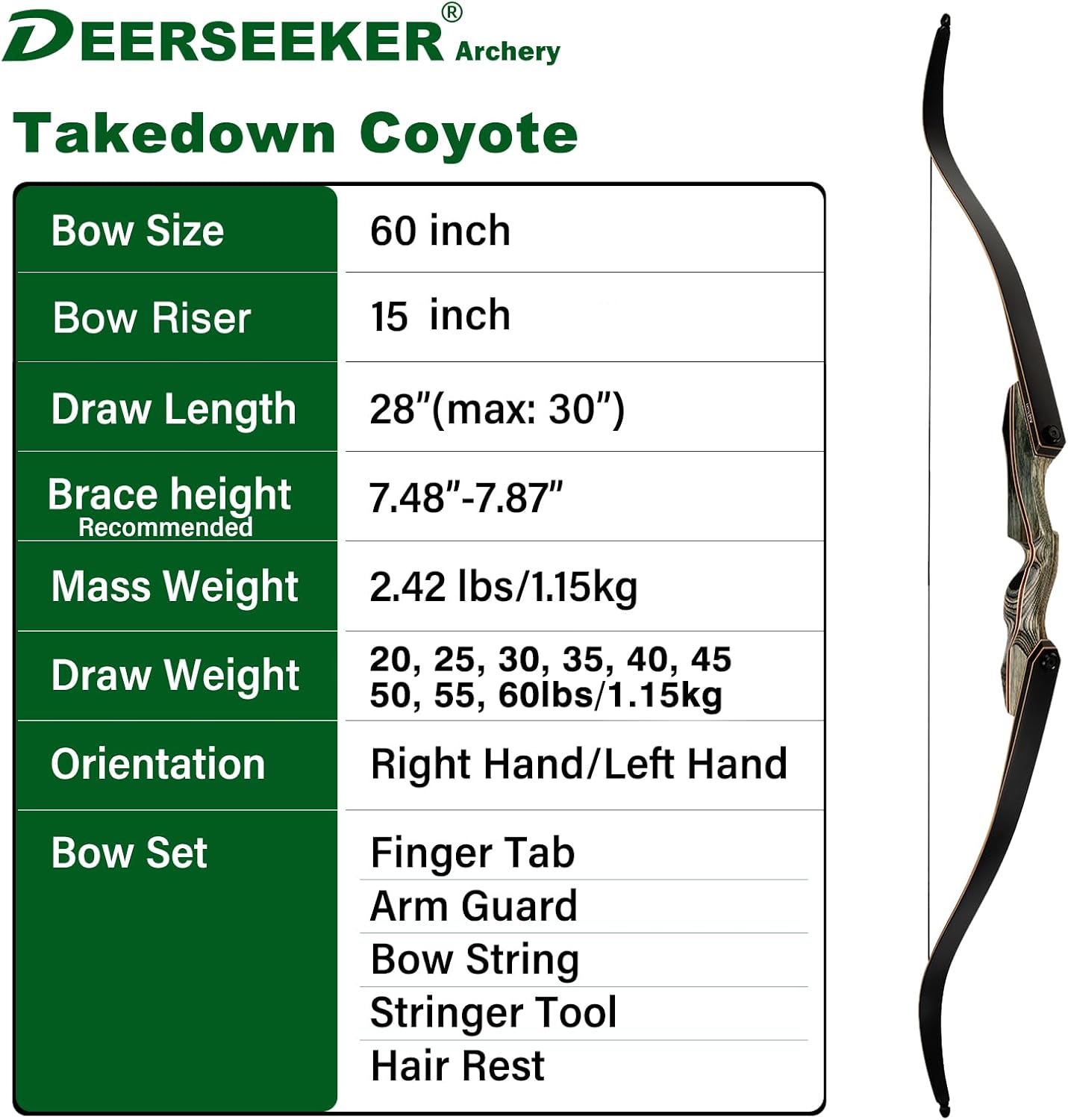 Deerseeker Archery 60″ Takedown Recurve Bow Set, Traditional Wooden Bow with Laminated Limbs for Adults & Youth Beginners – Right/Left Hand for Hunting, Practice& Target Shooting 15-60lbs