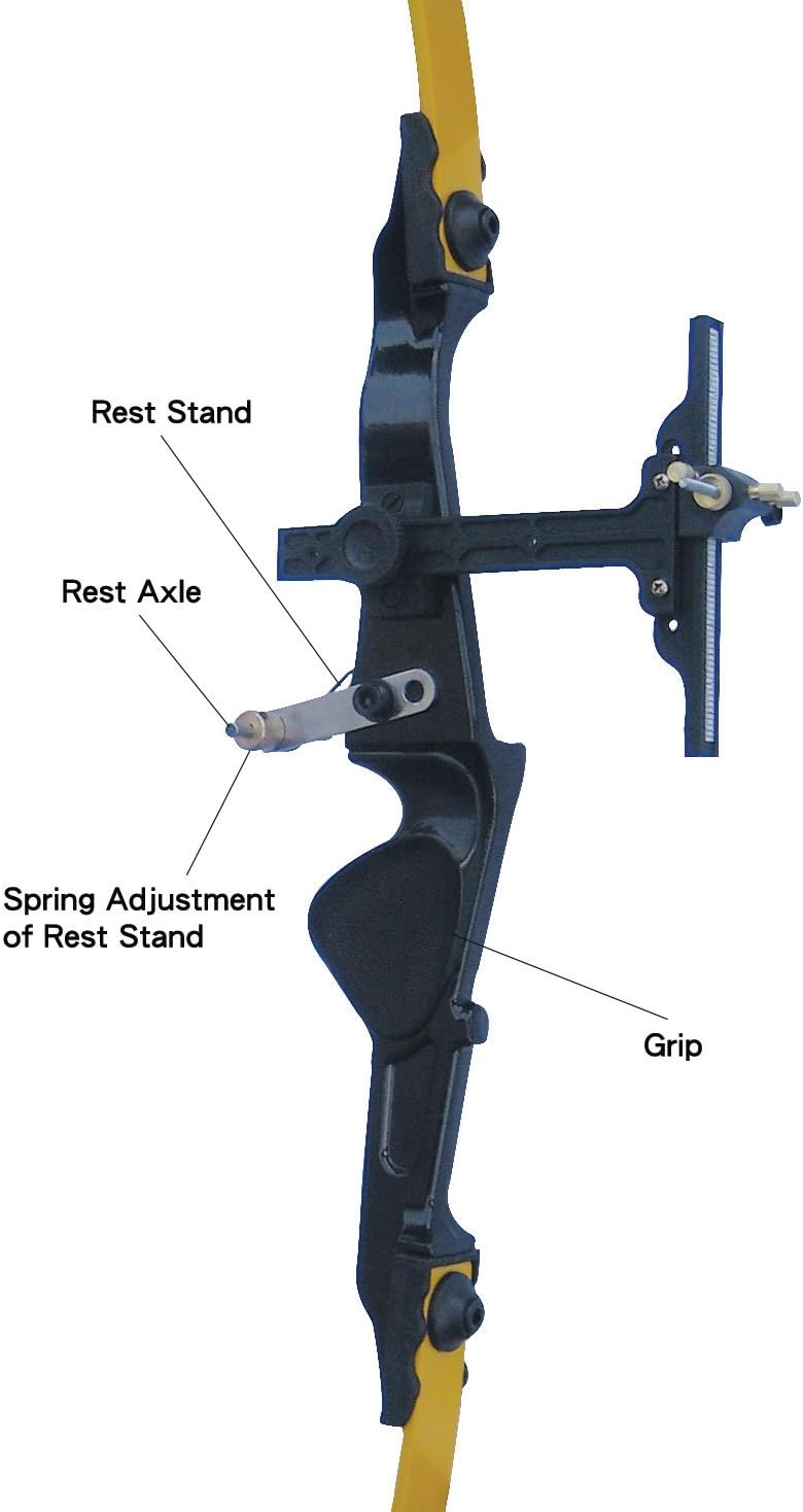 Spring-loaded rest unit to secure arrow while drawing; ergonomic Aluminum form-fitting handle; heavy-duty, all-weather string.