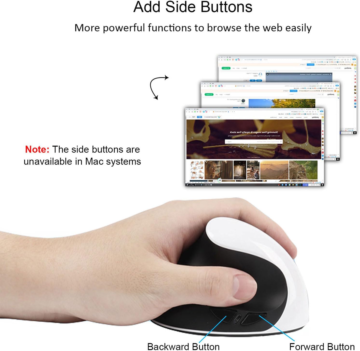 【Easier Web Browsing】New forward and back buttons on the side of the mouse allow you to jump to the desired page with a single thumb click, increasing your productivity. (Note: Not for Mac OS)