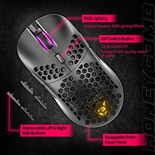 GUNMJO Gram DIY Honeycomb Shell 2.4G Wireless RGB Gaming Mouse, Gaming Wireless Mouse with 9 Buttons and Up to 10,000 DPI, Computer Mice for PC Gaming, Black Color