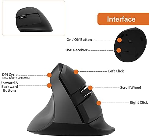 𝟐.𝟒 𝐆𝐇𝐳 𝐔𝐒𝐁 𝐍𝐀𝐍𝐎 𝐓𝐑𝐀𝐍𝐒𝐂𝐄𝐈𝐕𝐄𝐑 – Avoid unsightly cables and connect your wireless vertical mouse to your computer with the included USB Transceiver.