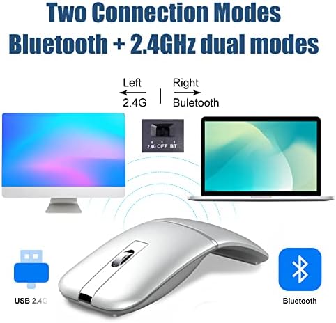 2.4GHz & Bluetooth 4.0 dual mode: This creatively and conveniently designed mouse,can work on TWO DEVICES, connecting one device through Bluetooth and the other via RF 2.4Ghz. If you are annoying that you have to own one Bluetooth mouse and one 2.4G wireless mouse separately for your laptop and tablet, or laptop and laptop, or laptop and desktop, this mouse is your ideal choice. You could intelligently switch the mode between both devices just by a click