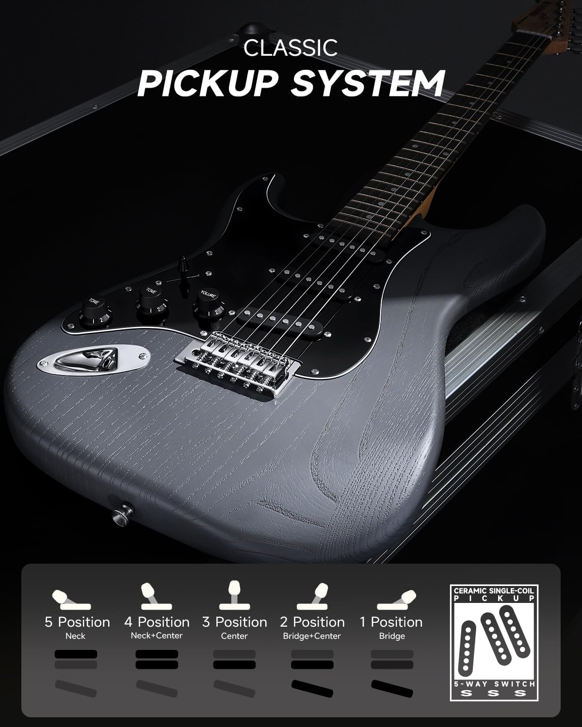 BUILT FOR COMFORT:This beginner electric guitar features an ultra-slim, comfortable C-shaped neck and satin matte finish, plus an easy-to-use circuit system, premium pickguard, and vintage tremolo bridge for a smooth, natural feel