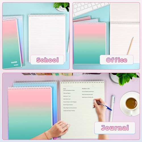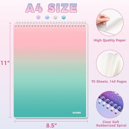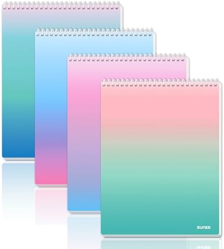 SUNEE 4 Pack Top Bound Spiral Notebook – A4 Lined Cute Notebook 8.5″ x 11″ Inches Plastic Waterproof Cover, 7mm Ruled 70 Sheets/140 Pages with 4 Aesthetic Colors – Journals for Study and Notes