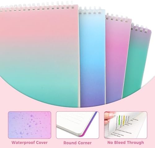 🌈Aesthetic Spiral Notebooks – 4 pack TOP spiral notebook with 4 gradient colors; Spiral Journals with 70 sheets/140 pages per pack, size – 8.5″ x 11″, standard easy-peel college ruled 7 mm paper avoids ink bleeding. Ruled notebook journal pages with smooth surface, which can bring you better writing and drawing experience.